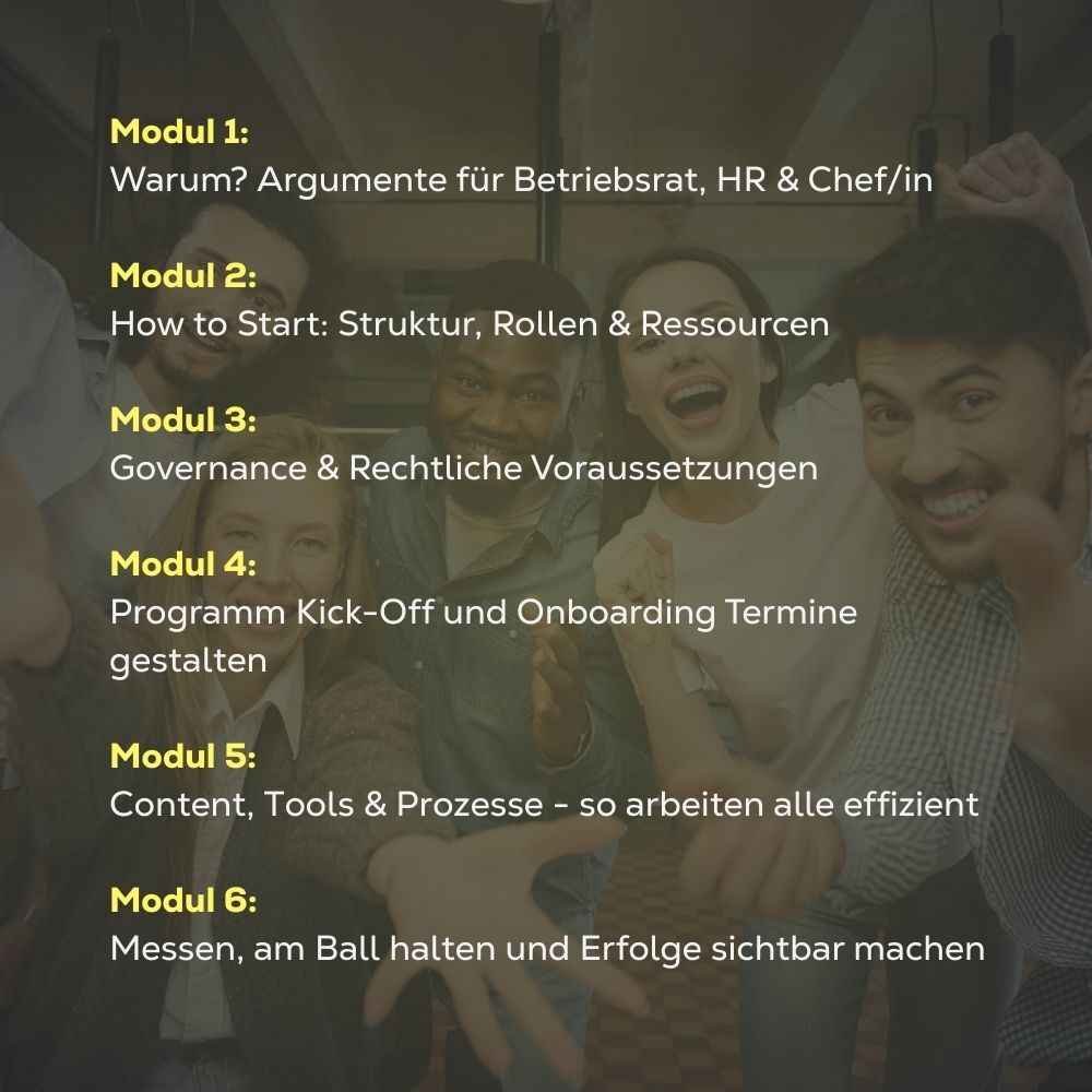 Wie überzeuge ich alle Stakeholder? Wie organisiere und strukturiere ich das Programm? Wie hole ich Teilnehmende dazu und sorge dafür, dass sie am Ball bleiben? Und wie messe ich das ganze?